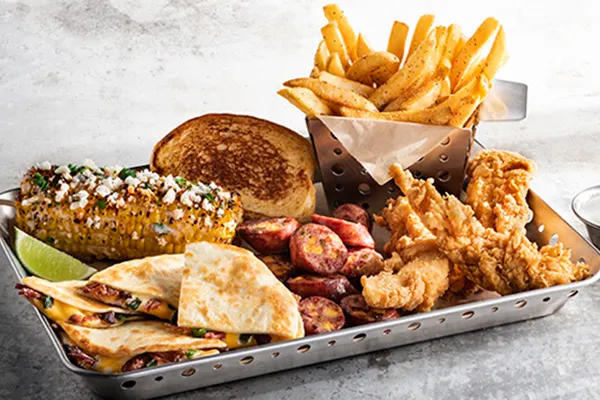 SERVED WITH ROASTED STREET CORN (210 cal), FRIES (420 cal) & GARLIC TOAST (140 cal).