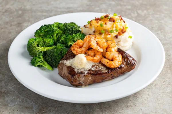 Marbled, thick-cut steak topped with garlic butter. Served with loaded mashed potatoes (add 350 cal) & steamed broccoli (add 40 cal). 21.29
